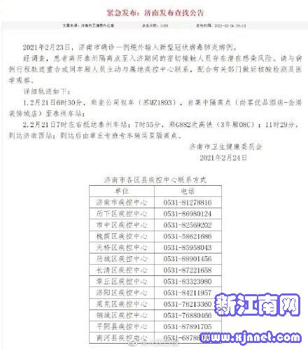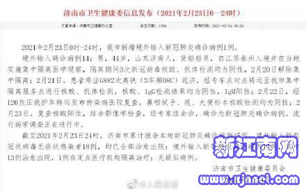 据山东省济南市卫健委,2月23日,济南市确诊一例境外输入新型冠状病毒肺炎病例。男,44岁,山东济南人,货船船员,自江苏泰州入境并在当地实施集中隔离医学观察,20日解除集中隔离,23日复查核酸阳性,确诊为新冠肺炎确诊病例。5xl新江南网|江南区域知名综合门户网