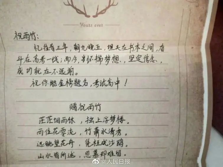 2、毕业高三班长把全班名字写成诗 高考结束,贵州省毕节一中高三班的48名同学都收到了班长黄圳稳的一封信,里面是一首藏着自己名字的诗词。他表示希望大家圆满结束高中生活,记住自己很爱他们。(@人民日报)