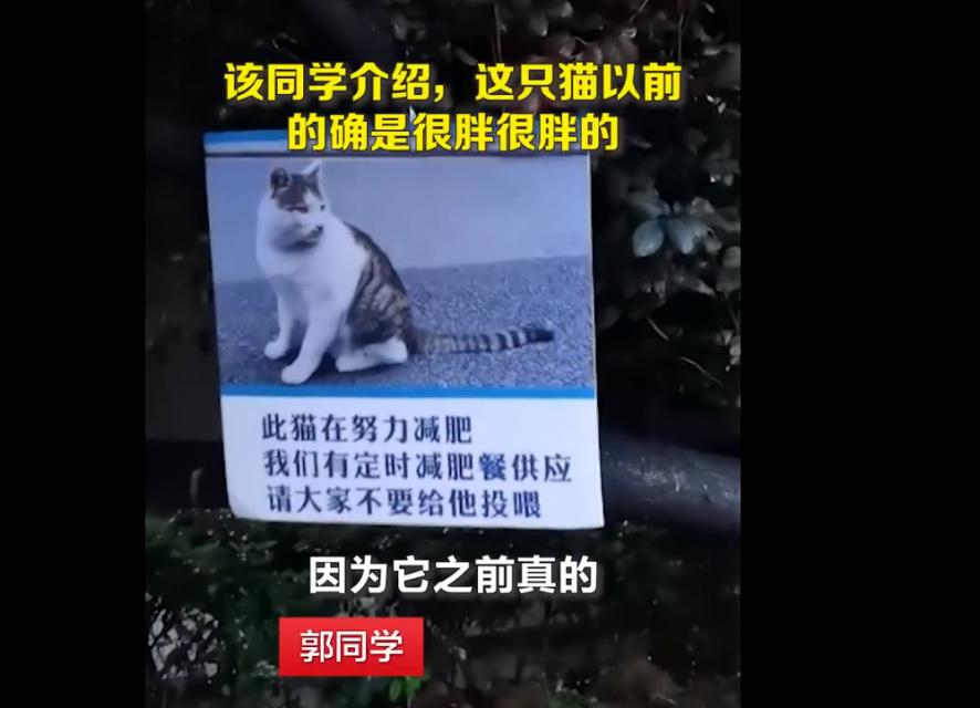 3、流浪猫因吃太胖被挂牌强制减肥 12日,湖北武汉,一位同学取快递时,发现附近有只猫咪,旁边树上还挂了一块牌子,称该猫正在减肥,有人定期供应减肥餐,请大家不要再投喂它。该同学介绍,之前这只猫的确是很胖很胖的。(@荔枝新闻)