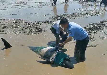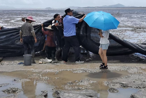 由于当时正是退潮期间,水位较低,执法小艇无法驶入该区域,11名执法人员选择在大竹山上岸,前往北洋坝开展救援。到达现场后,执法人员发现一共有12头鲸豚(疑似)搁浅在滩涂上,执法人员和已经在现场的乡镇、公安、消防等工作人员一起分工合作,一部分在岸边挖水坑,然后四五个人为一小组,将搁浅在滩涂上的生物,一头一头地扛到挖好的水坑里,并为它们盖上湿毛巾,不断地给它们的身上浇水,防止身上的水分蒸发。