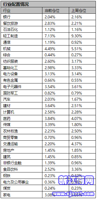 整体来看,基金配置比例位居前三的行业是轻工制造、机械和医药,配置仓位分别为7.13%、4.49%和3.84%;基金配置比例居后的三个行业是钢铁、煤炭和电力及公用事业,配置仓位分别为0.23%、0.24%和0.36%。