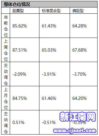 其中,股票型基金仓位下降1.89%,标准混合型基金仓位下降3.60%,当前仓位分别为85.62%和61.43%。
