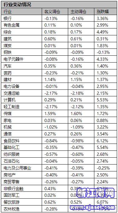 行业配置方面,传媒、建材和建筑三个板块被公募基金主动相对大幅加仓,幅度分别为1.59%、1.14%和0.62%;而交通运输、轻工制造和机械逐渐主动减持,与名义调仓基本一致,减仓幅度分别为2.17%、2.17%和1.02%。