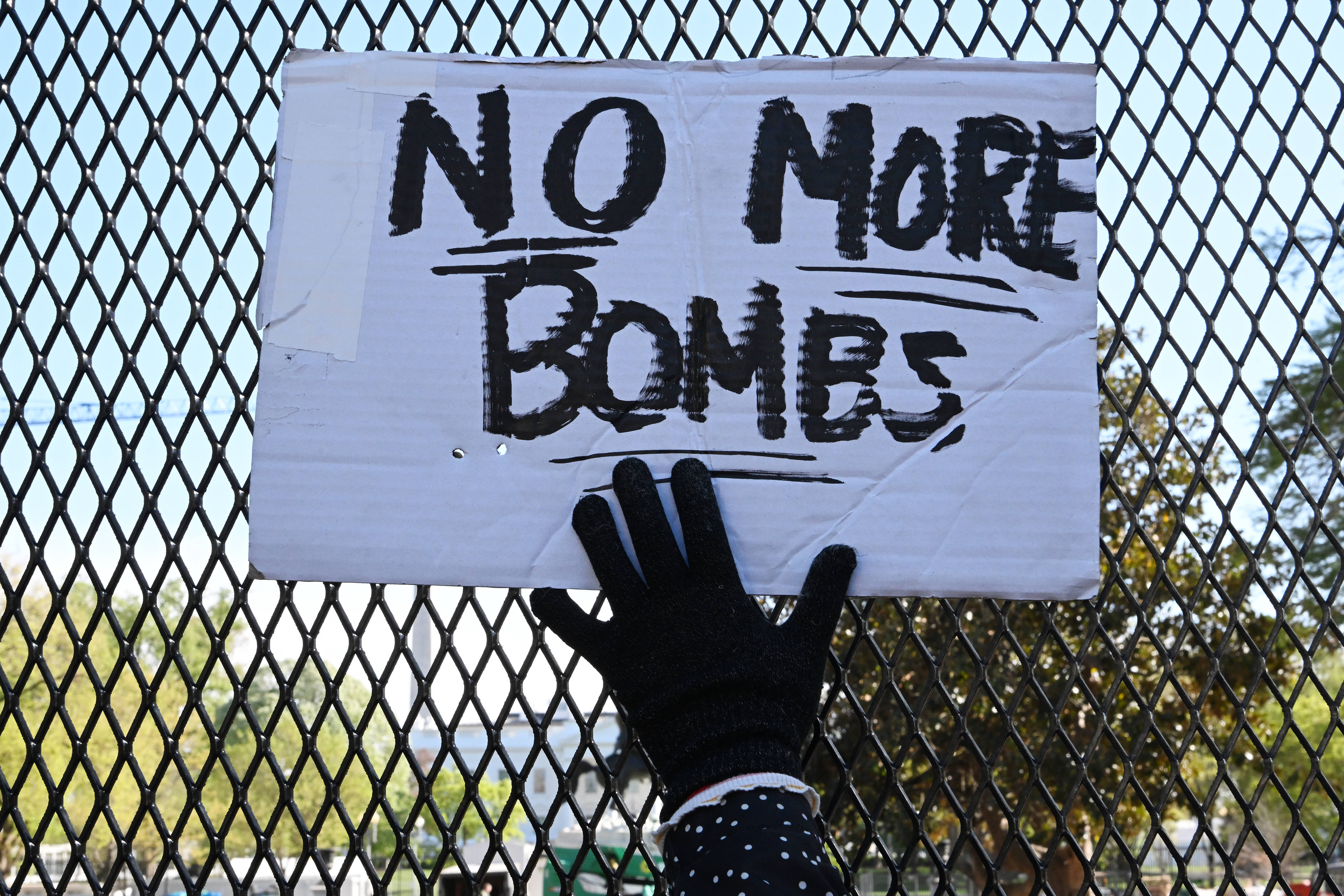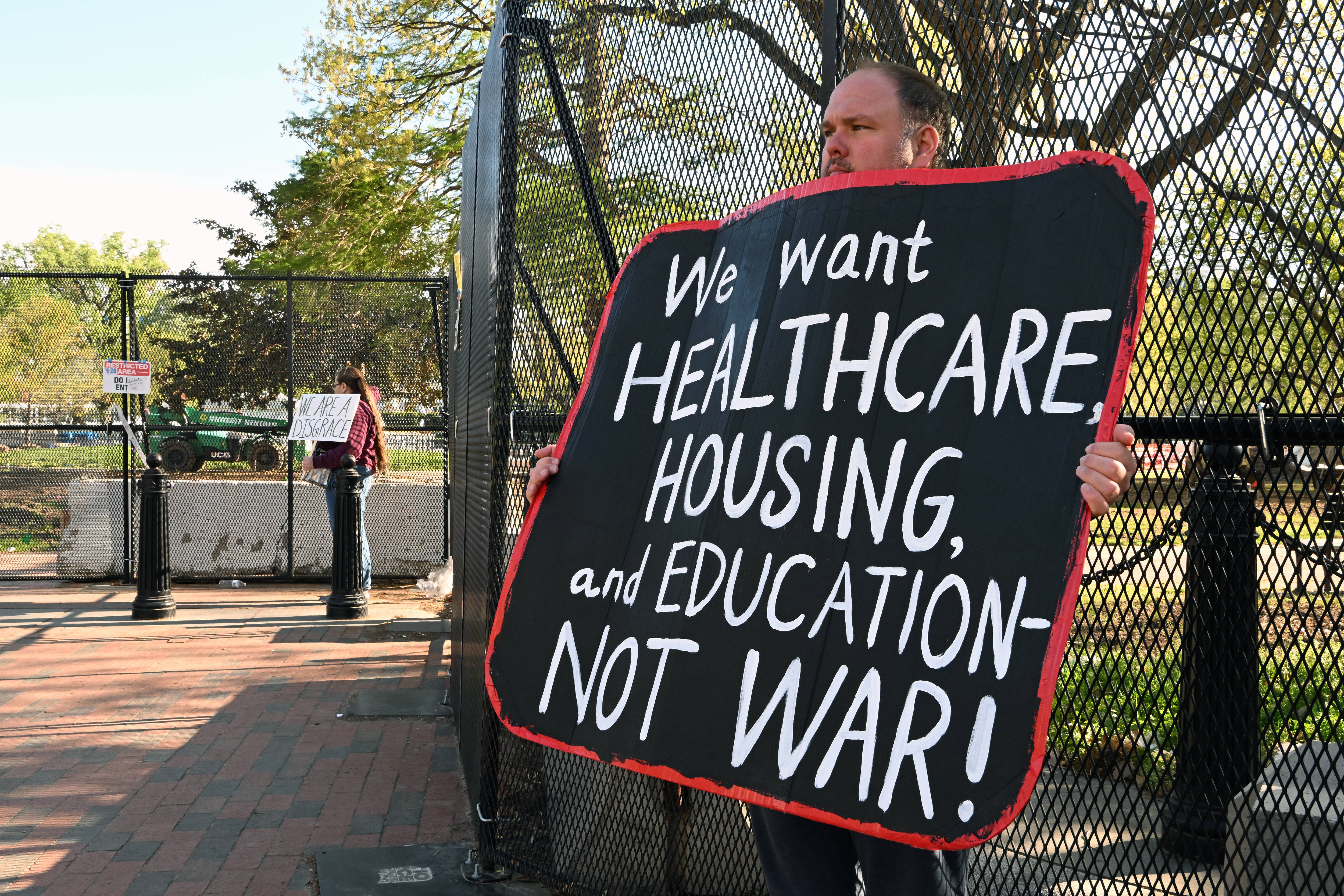 4月7日,一名示威者在美国首都华盛顿的白宫前手举标语。 新华社记者 李睿 摄