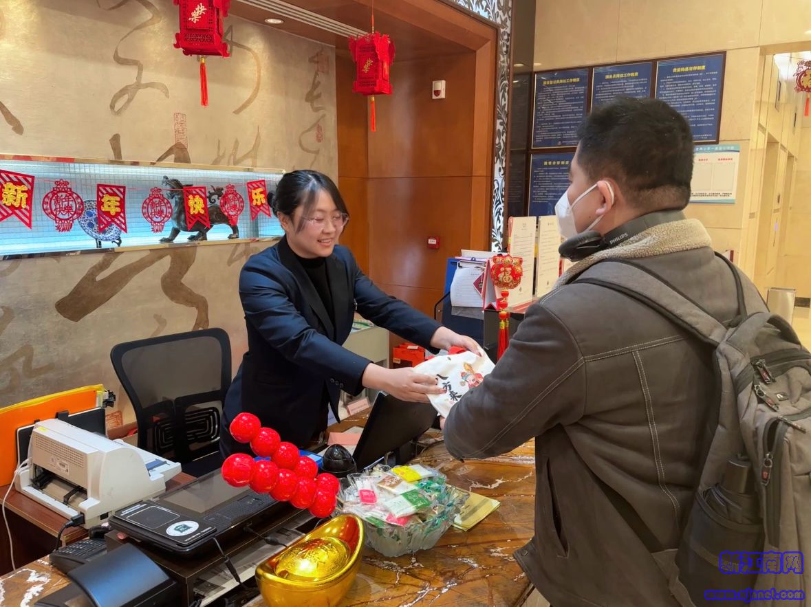 国信大酒店工作人员用心服务每一位顾客。酒店坐落于南京长江路、毗邻德基广场,周边景点云集、美食荟萃,新街口等繁华商圈近在咫尺,得天独厚的位置让其成为游客打卡南京的优选住宿。酒店从春节假期前一日开始,入住率就保持在较高水平。为了兼顾市场需求与经营实际,酒店今年还采取了更为亲民的价格策略,整体房价较去年有所下调,春节期间平均房价每间约500元,高性价比进一步提升了吸引力。