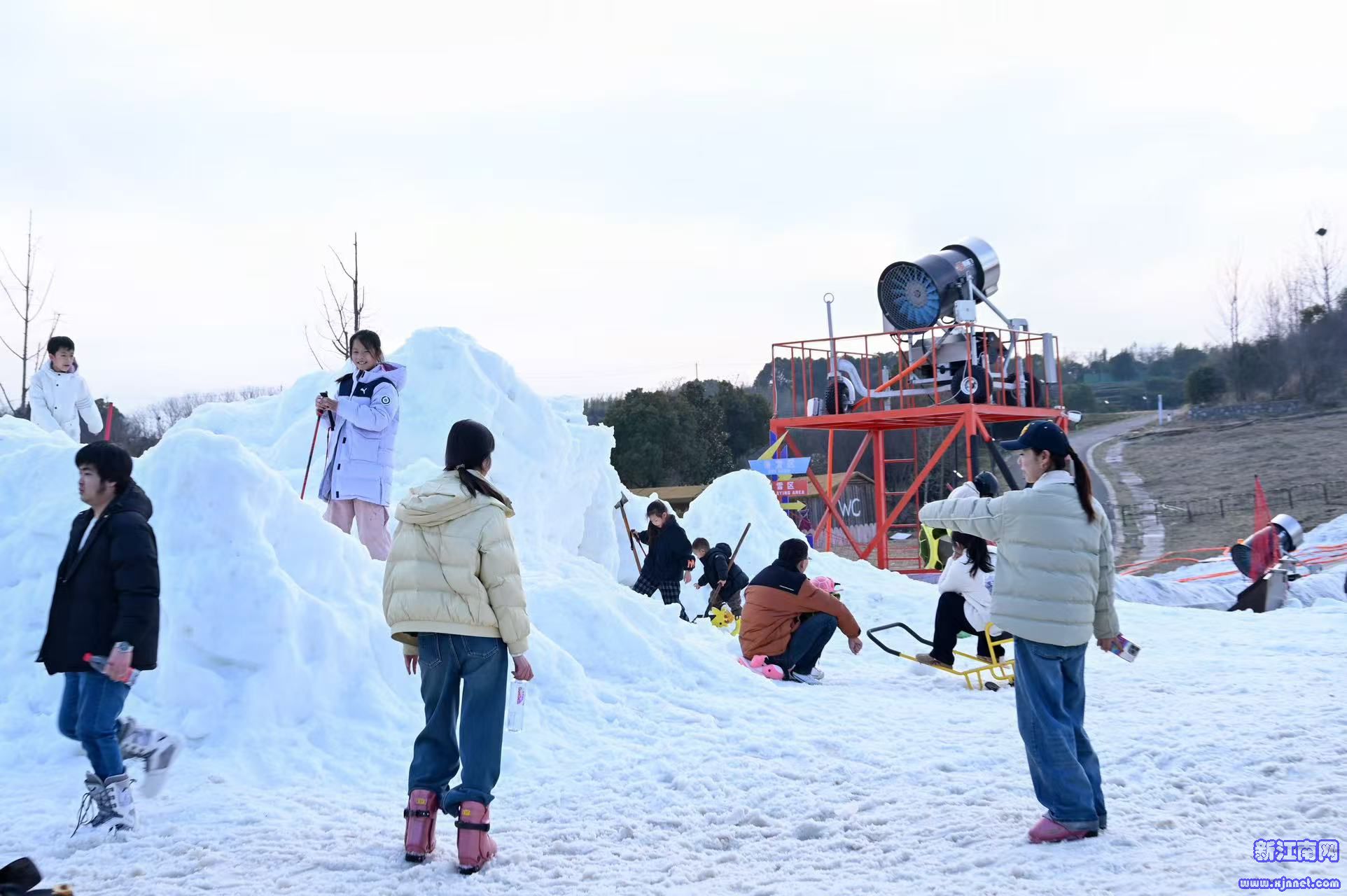 雪场一旁的摊位同样忙碌。大埝社区居民朱孝金春节前采购了一批商品,包括戏雪铲、手套以及特色文创等,成本价5000元。到大年初二,他已经开始盈利。按照往年经验,这个春节假期能给他带来大几千元的收入。