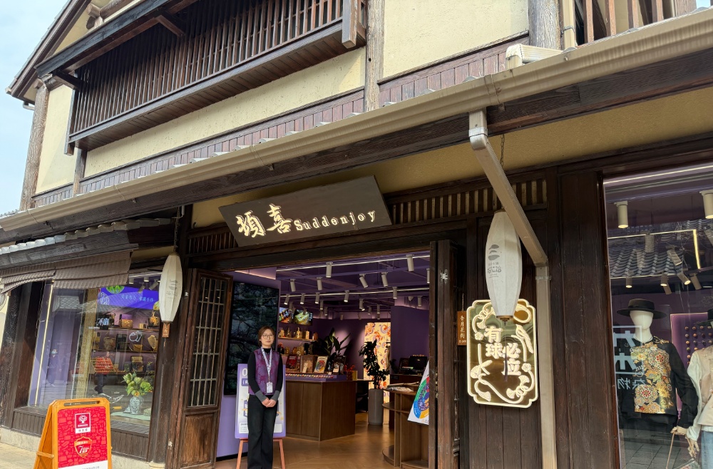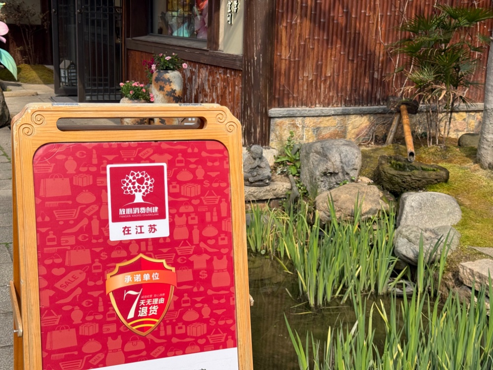 记者注意到,拈花湾景区每家商铺的门口都摆放着一块醒目的红色招牌,上面写着“放心消费在江苏”“7天无理由退货承诺单位”。