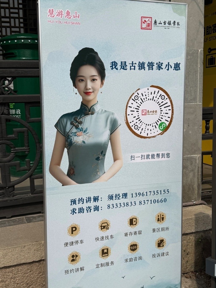 行走在惠山古镇,记者发现每隔一段距离就能看见“我是古镇管家小惠,扫一扫就能帮到您”的二维码,扫码即可进入“慧游惠山”小程序,小程序不仅显示景区当前游客数、剩余停车位等,还设置了求助咨询、投诉建议等模块。