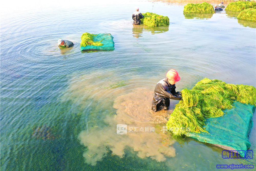 (特约摄影 刘彬 7:41摄 10:19上线)3月29日,淮安市洪泽区东双沟镇沿河村,村民在收获“伊乐藻”水草,出售给本地及周边螃蟹、龙虾养殖户移栽,腾塘春放虾苗助力增收富民。