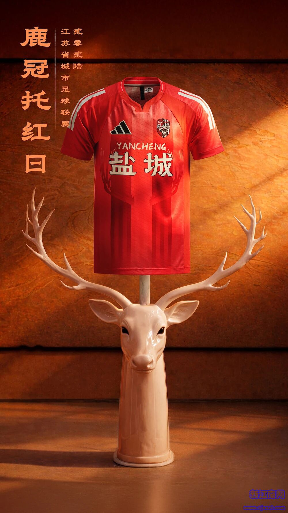 赤焰燃旷野,锋芒自天成主场球衣以赤焰红为主色调,热烈而厚重,自带一往无前的气场。设计立足“东方湿地之都”“麋鹿之乡”的城市定位,将盐城最具标识性的麋鹿图腾,化作衣间最醒目的视觉符号。