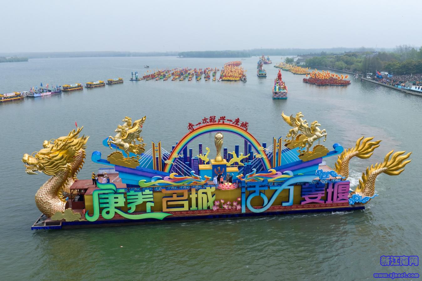 率先出场的领航船迅速抓住观众的眼光,船身“康养名城 活力姜堰”四个大字展现姜堰城市风貌,紧随其后的祭祀船载着“风调雨顺 国泰民安”的美好祝福穿湖而过,生肖船以“骐骥驰骋 福禄祯祥”为意,融入丰富的马年元素,展现奋进姿态。四条祈福船是今年会船节的一大亮点,“勤来溱湖 养生养福”“梦回溱湖湾 爱在鹊仙岛”“奋楫争先 立篙潮头”“来姜堰 赢将来”,四大主题传递着对福寿安康、爱情美满、学业有成、事业兴旺的美好愿景。