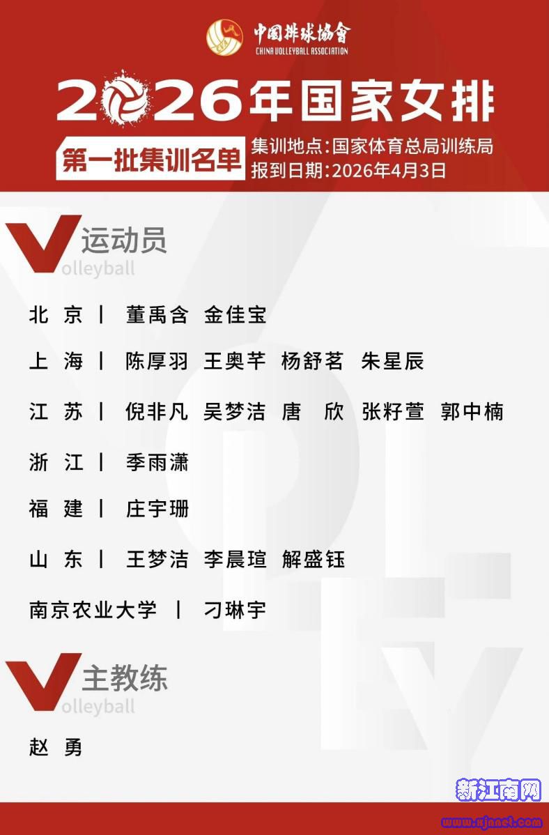 交汇点讯 近日,国家体育总局排球运动管理中心,公布2026年国家女排第一批集训名单,17名入选运动员中,6名来自江苏,人数居首。这批名单里的“南京力量”尤为瞩目——倪非凡、吴梦洁、张籽萱、刁琳宇4人均与南京有着不解之缘。
