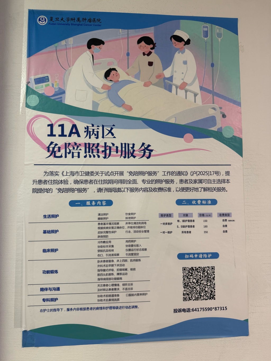复旦大学附属肿瘤医院胰腺外科病区张贴的陪护服务的价格收费标准。