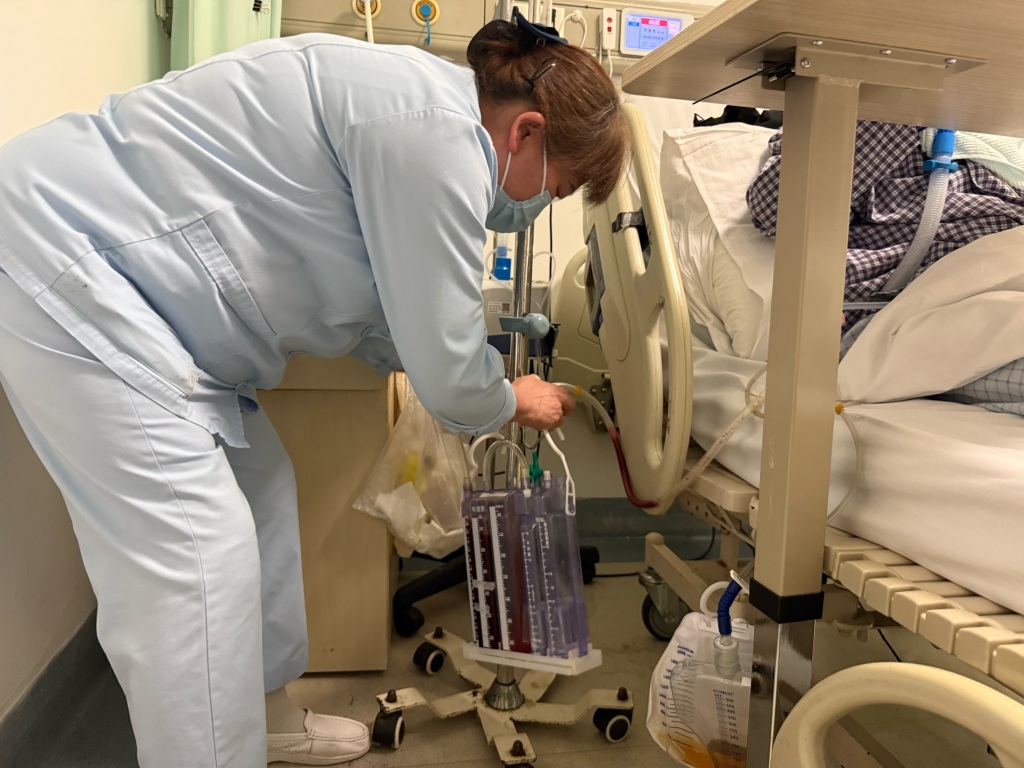 护理员帮助患者整理身上的引流管。本文图均为 澎湃新闻记者 陈斯斯 摄
