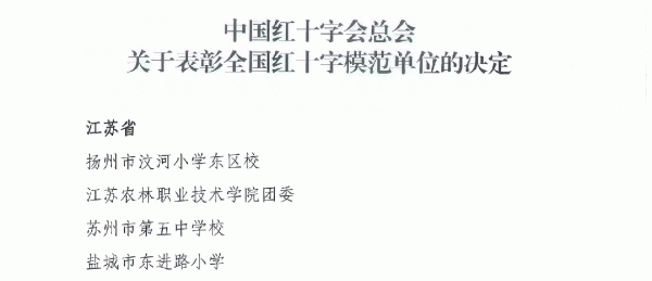 近日,中国红十字会总会印发《关于表彰全国红十字模范单位的决定》,苏州市第五中学校被授予“全国红十字模范单位称号”!在全国获评的99所学校中,江苏省仅有4所,苏州市第五中学校是全省唯一获此国家级殊荣的中学!
