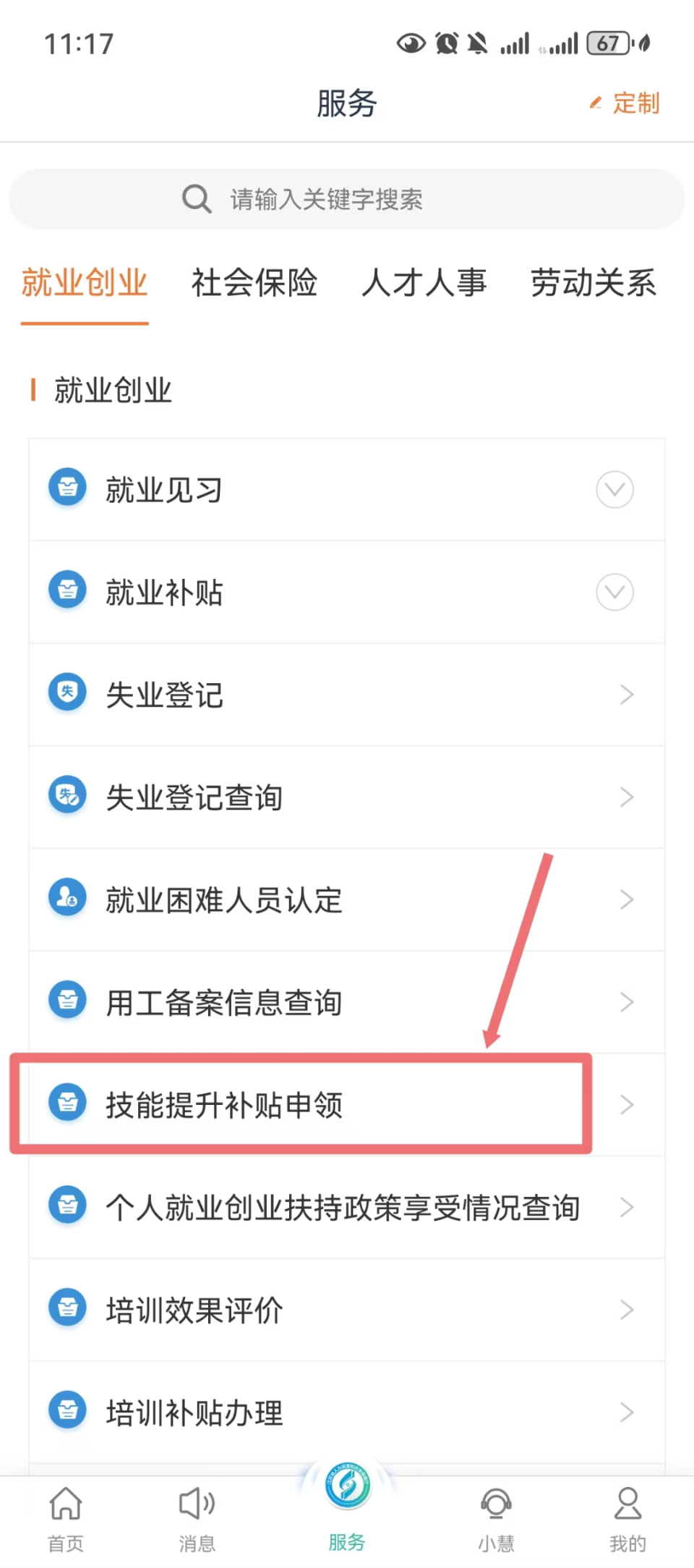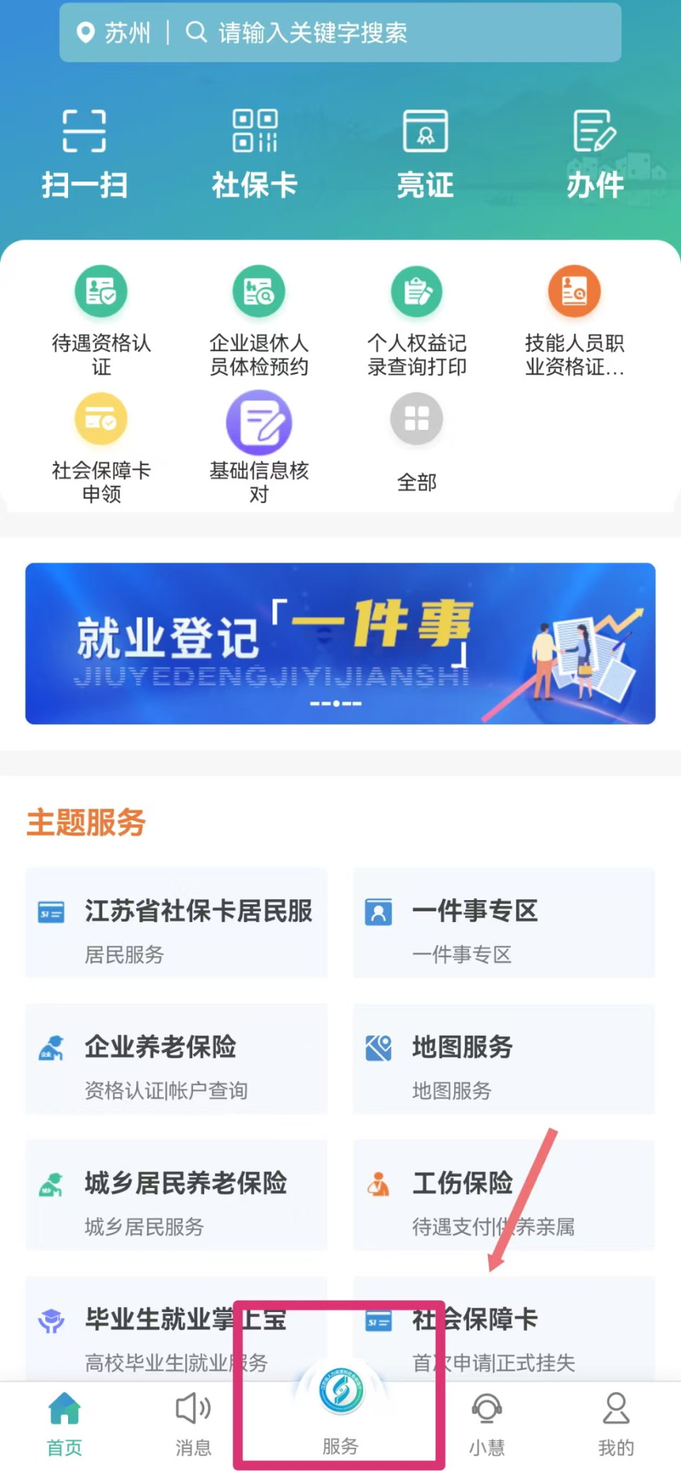 登录“江苏智慧人社”APP或小程序,选择参保地苏州,点击“服务”选项。