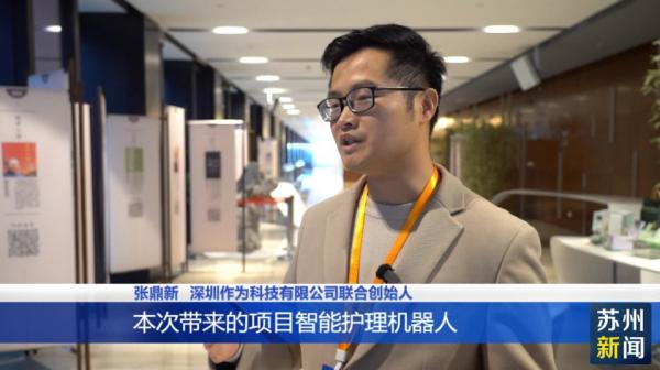 深圳作为科技有限公司联合创始人张鼎新介绍,本次带来的项目是智能护理机器人,针对失能偏瘫老人,实现自动感应,自动抽污,温水冲洗,暖风烘干,消毒杀菌除臭。此前一直对苏州市场非常关注,机构、社区和居家这几个场景,都会涉及到失能老人照护的问题,都非常适用这款产品。