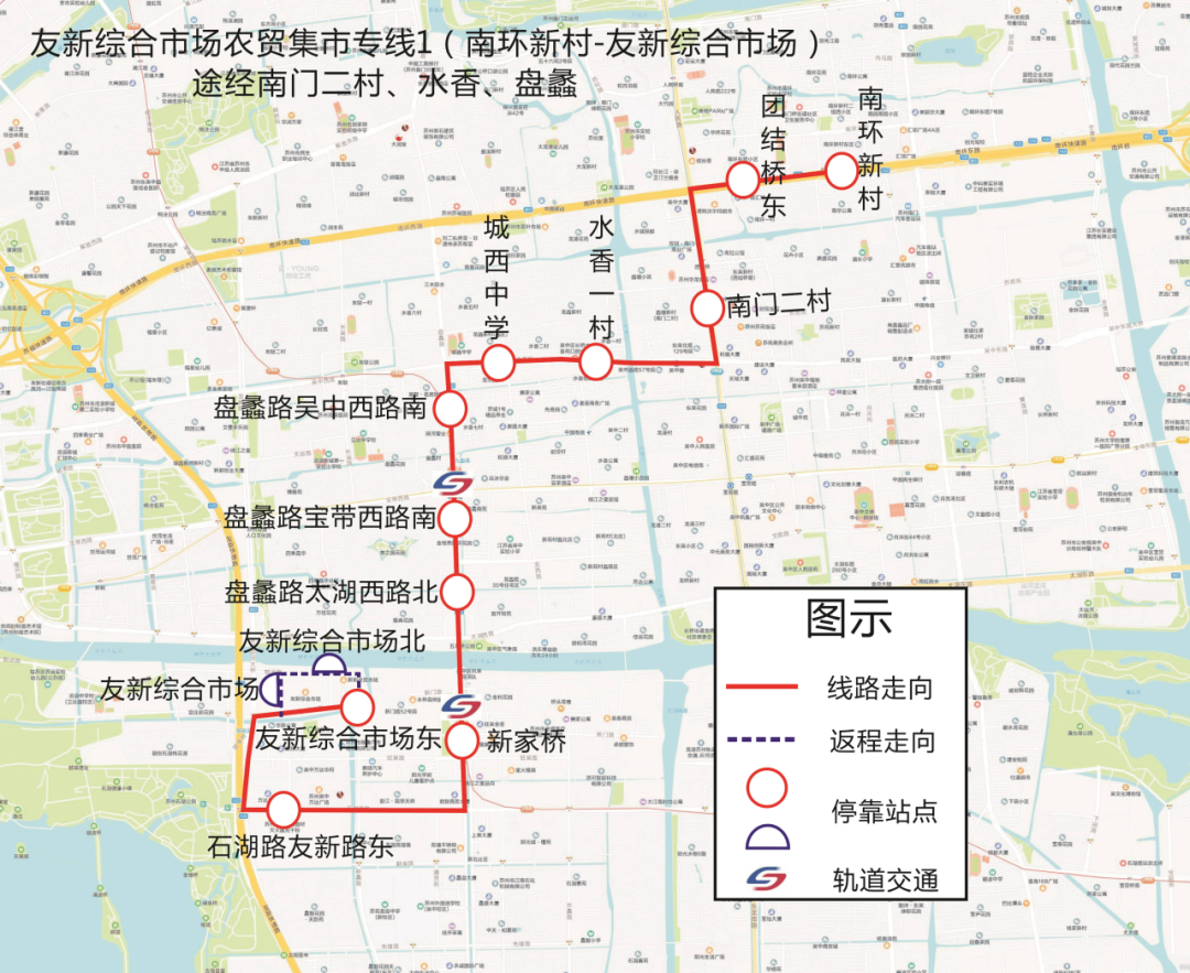 往友新综合市场方向:南环新村、团结桥东、南门二村、水香一村、城西中学、盘蠡路吴中西路南、盘蠡路宝带西路南、盘蠡路太湖西路北、新家桥、石湖路友新路东、友新综合市场东;