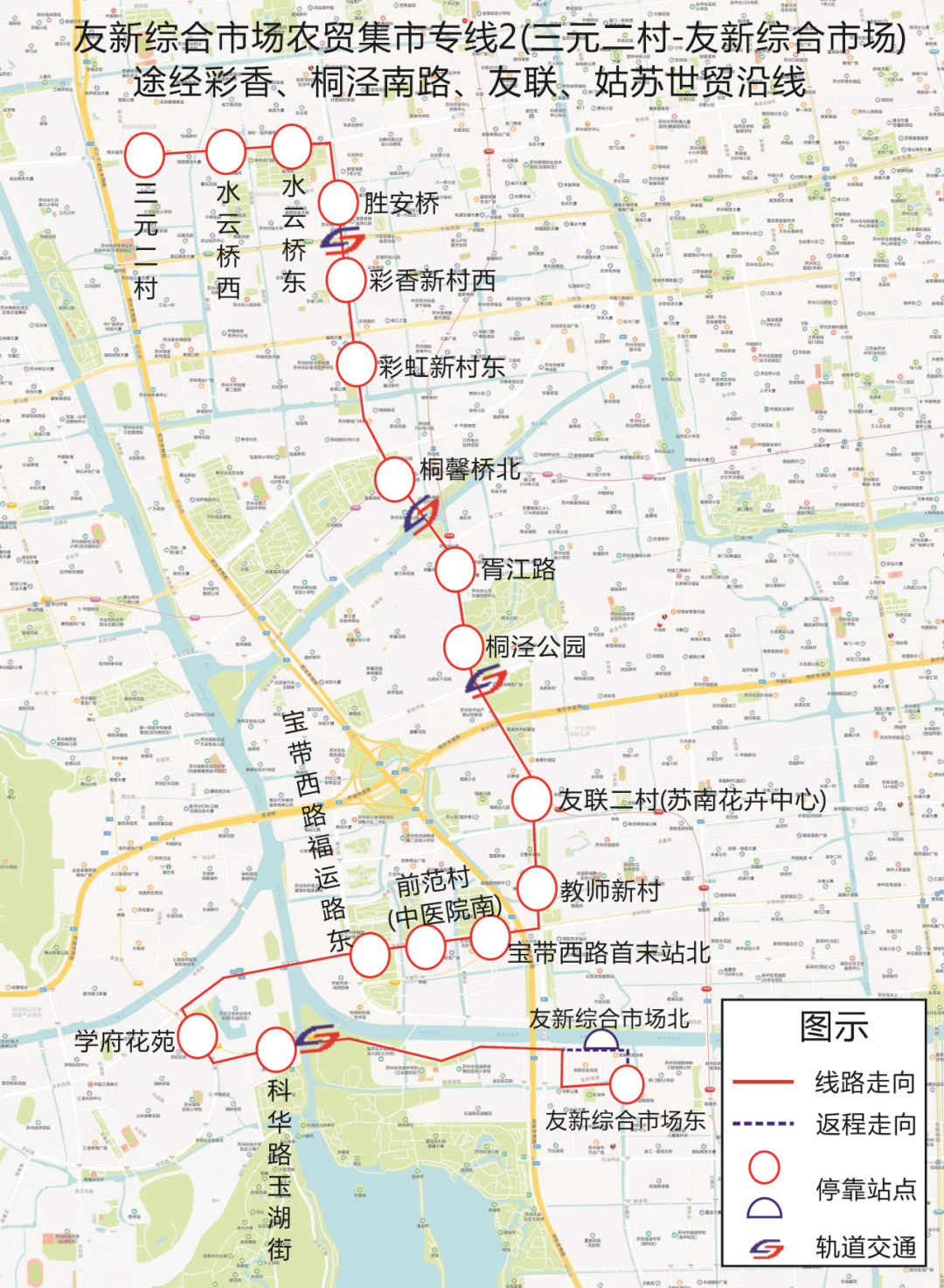 往友新综合市场方向:三元二村、水云桥西、水云桥东、胜安桥、彩香新村西、彩虹新村东、桐馨桥北、胥江路、桐泾公园、友联二村(苏南花卉中心)、教师新村、宝带西路首末站北、前范村、宝带西路福运路东、学府花苑、科华路玉湖街、友新综合市场东;