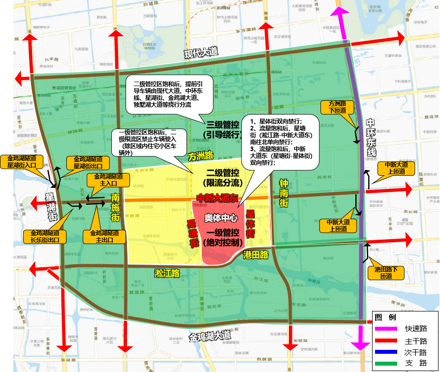 星湖街、现代大道、星华街、金鸡湖大道等道路(不含上述道路)往奥体中心方向货车禁止驶入、客车限流。