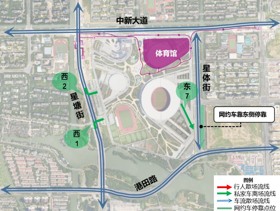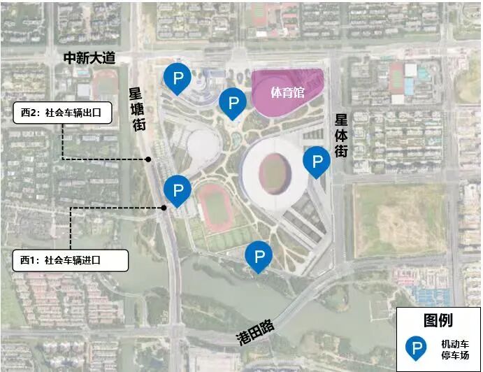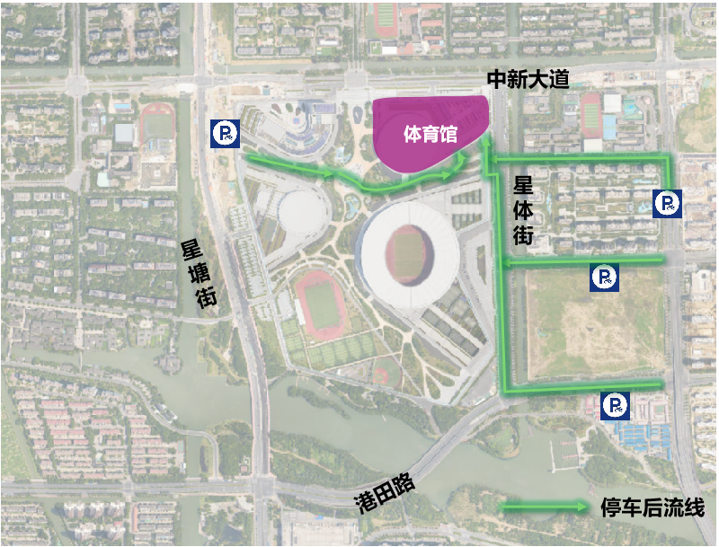 此外,部分路口将调用特殊放行方式:星塘街-中新大道东调用“南放行”,中新大道东-星华街调用“西放行”,港田路-星华街调用“西放行”,加快车辆驶离奥体中心。
