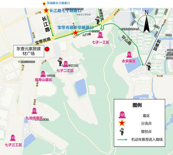 上述墓区停车资源有限,建议将私家车停放至东壹元家居建材广场停车场换乘七子公墓接驳专线至相应墓区。