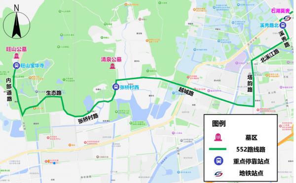 注:扫墓结束后,可至原线下车站点对向公交站点乘车返回地铁3号线石湖北站或石湖渔家村停车场。