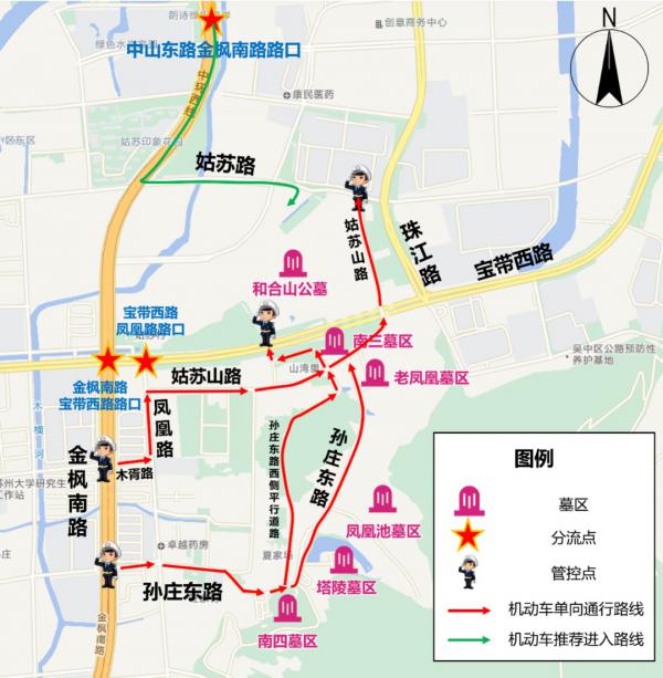 (2)凤凰公墓(南三墓区):中环西线快速路(刘庄路出口)-金枫南路-木胥路-凤凰路-姑苏山路(南三墓区)。