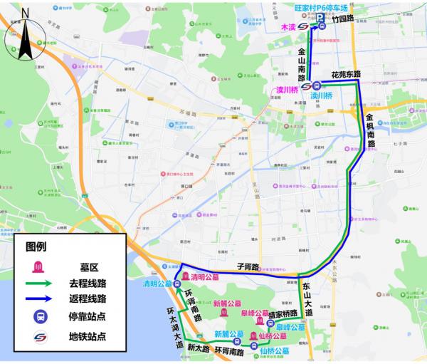 接驳线路(7:00-13:00):旺家村P6停车场(地铁1号线木渎站东侧200米)-竹园路-金山南路-花苑东路(渎川桥公交站:地铁5号线渎川桥站东侧60米)-金枫南路-东山大道-盛家桥路-环胥南路(皋峰公墓、仙桥公墓、新麓公墓)-新太路-环太湖大道-环胥南路(清明公墓)-子胥路-金枫南路-花苑东路(渎川桥公交站:地铁5号线渎川桥站东侧60米)-金山南路-竹园路-旺家村P6停车场(地铁1号线木渎站东侧200米)。