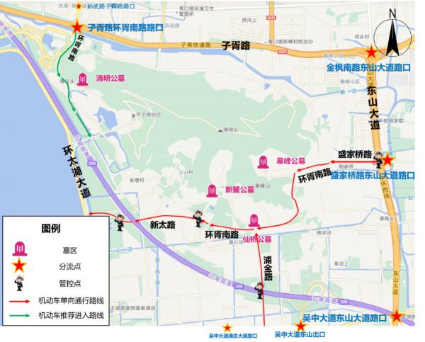 2)绕城高速(东山出口)-吴中大道-浦金路-环胥南路(仙桥公墓,新麓公墓)。