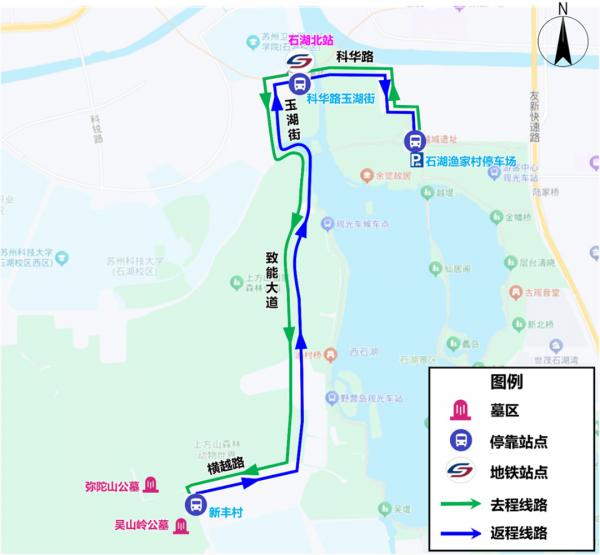 接驳线路(7:00-13:00):石湖渔家村停车场-科华路(地铁3号线石湖北地铁站)-玉湖街-致能大道-横越路(吴山岭墓区、弥陀山公墓)。