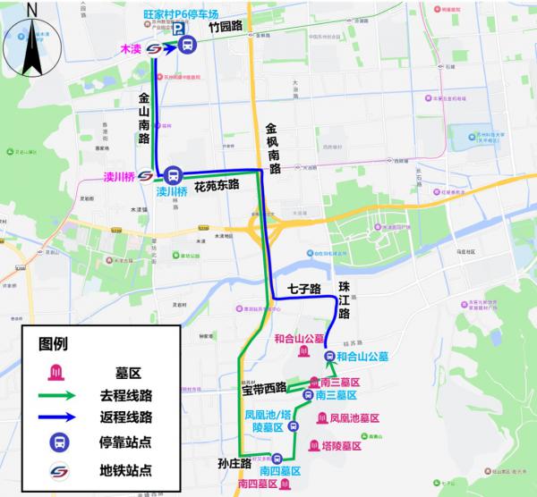 接驳线路(7:00-13:00):旺家村P6停车场(地铁1号线木渎站东侧200米)-竹园路-金山南路-花苑东路(渎川桥公交站:地铁5号线渎川桥站东侧60米)-金枫南路-孙庄路(南四墓区、塔陵墓区、凤凰池墓区、老凤凰墓区、南三墓区)-宝带西路-珠江路(和合山公墓)-七子路-金枫南路-花苑东路(渎川桥公交站:地铁5号线渎川桥站东侧60米)-金山南路-竹园路-旺家村P6停车场(地铁1号线木渎站东侧200米)。