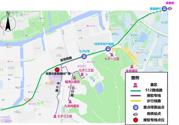 注:1、清明扫墓期间,常规公交512路7:00-13:00加密发车班次。2、扫墓结束后,可至原线下车站点对向公交站点乘车返回地铁2/3号线盘蠡路站。