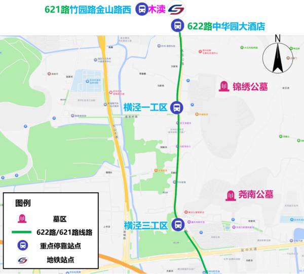 注:1、清明扫墓期间,常规公交621路、622路7:00-13:00加密发车班次。2、扫墓结束后,可至原线下车站点对向公交站点乘车返回地铁1号线木渎站。