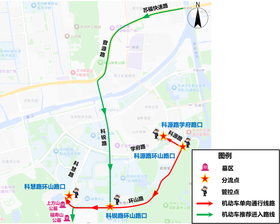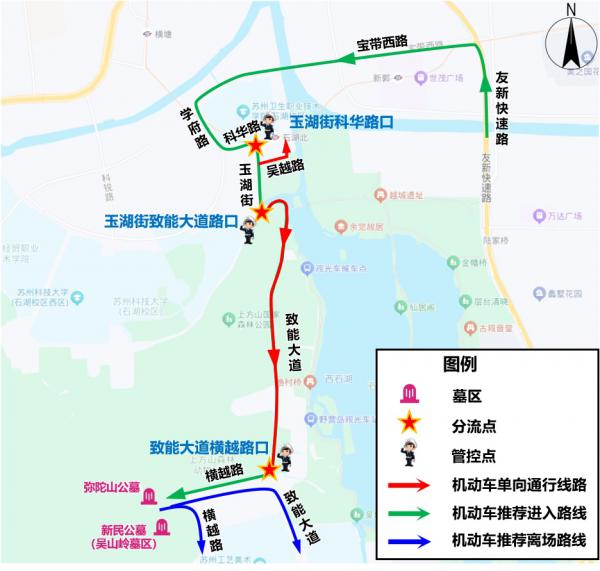 ·行车线路:友新快速路(宝带西路出口)-宝带西路-学府路-科华路-玉湖街-致能大道-横越路(吴山岭墓区、弥陀山公墓)。