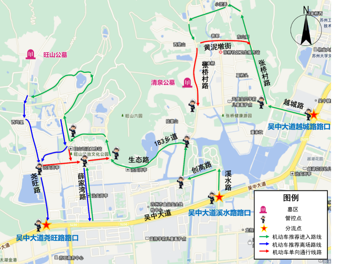 1)绕城高速(西山出口)-孙武路-子胥路-环胥南路(清明公墓);
