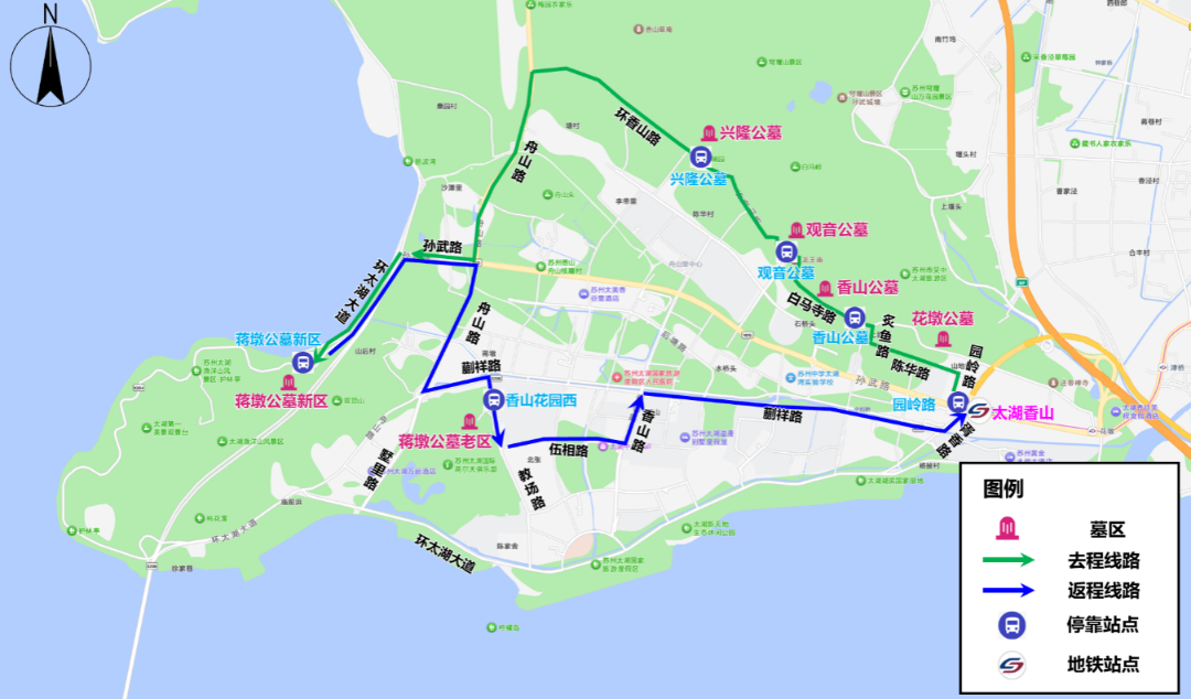 注:扫墓结束后,可至原线下车站点乘公交接驳专线返回地铁5号线太湖香山站。