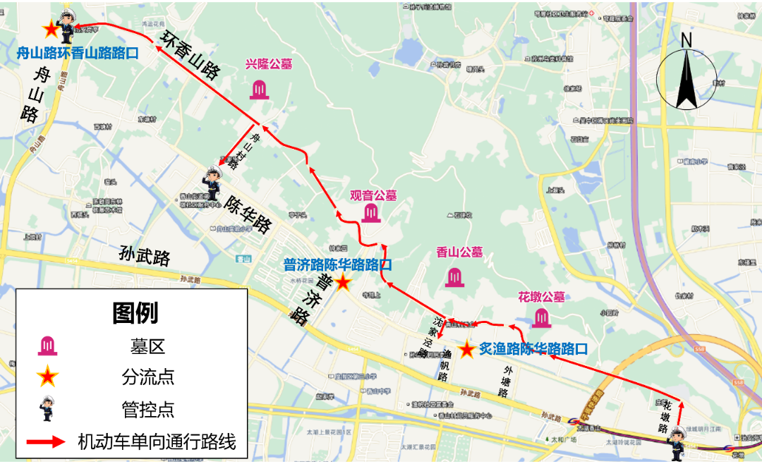 子胥快速路(陈华路出口)-陈华路-炙渔路-环香山路(香山公墓、观音公墓、兴隆公墓)。