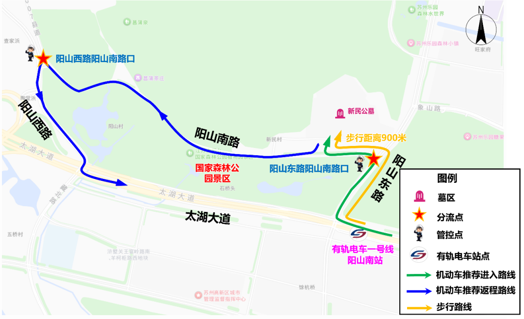 注:扫墓结束后,骑共享单车或步行返回有轨电车1号线阳山南站。