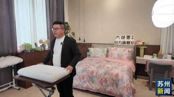 走进太湖雪直播基地,这里的多个直播间都在进行着当下热门新品的直播销售。借助蚕丝这一王牌核心,企业通过“非遗技艺+新零售”的模式持续破圈,成功挖掘年轻群体的市场消费潜力。