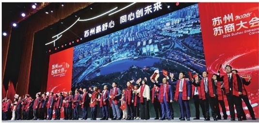 会上,播放了主题片《苏商·苏Shine》,发布了《苏州市重点新兴产业和重点未来产业名单》《苏州市构建一流营商环境行动方案(2026年)》。24位企业家代表上台发布《苏商之光,点亮苏州》倡议书,发出了“胸怀报国志、一心谋发展、守法善经营、先富促共富”的倡议。