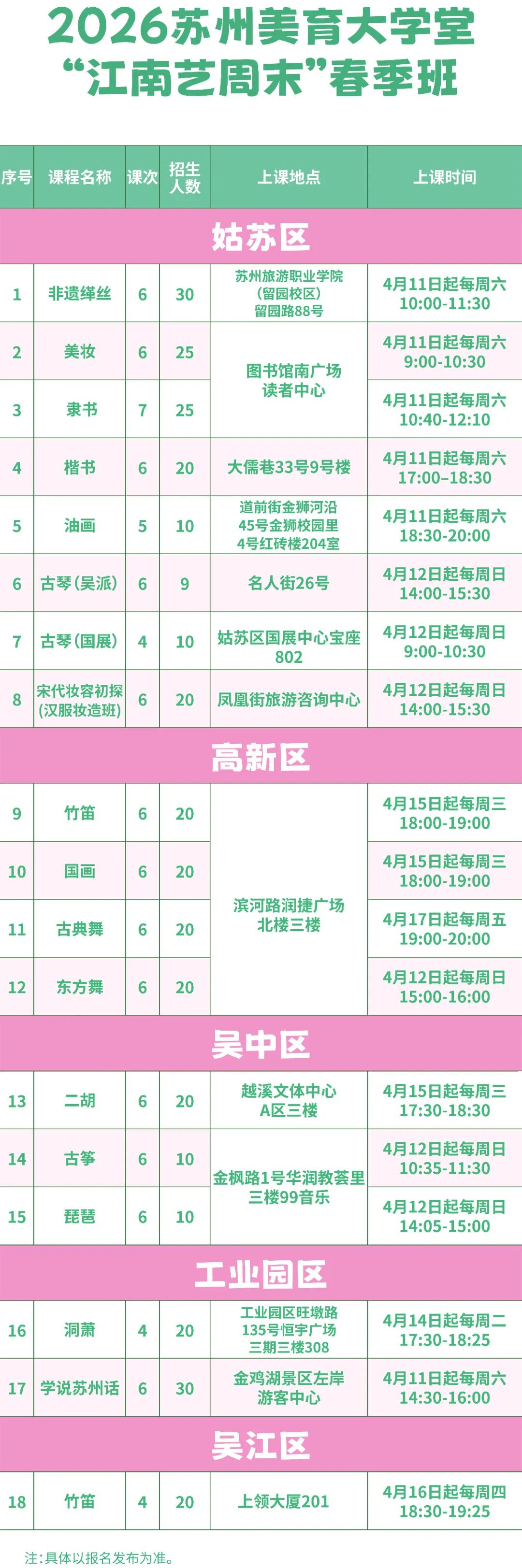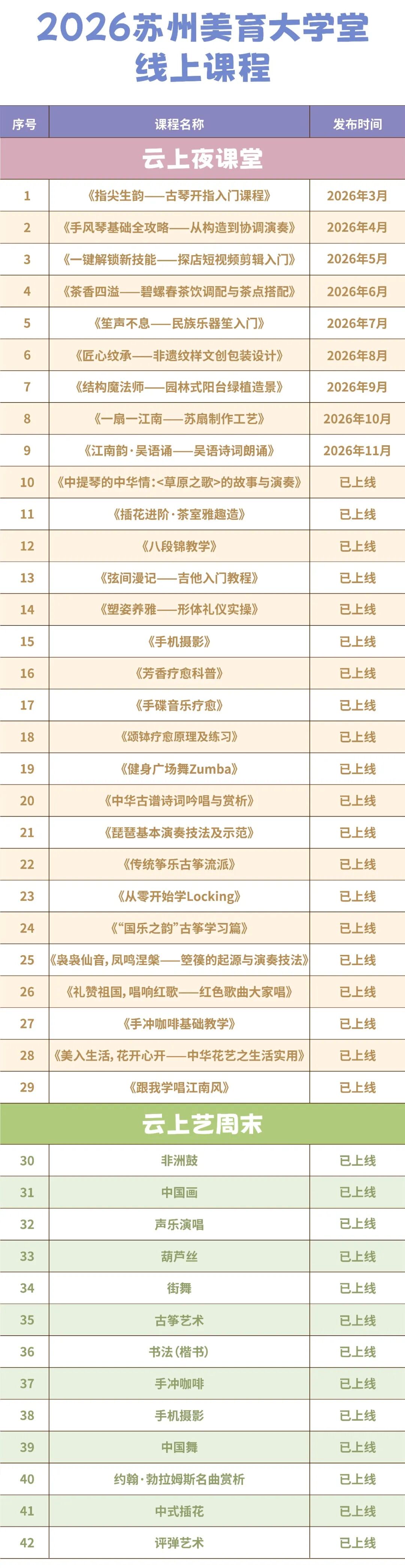 市区联动、全龄全时,持续开展多年、广受社会好评的苏州美育大学堂2026春季班即将焕新登场!