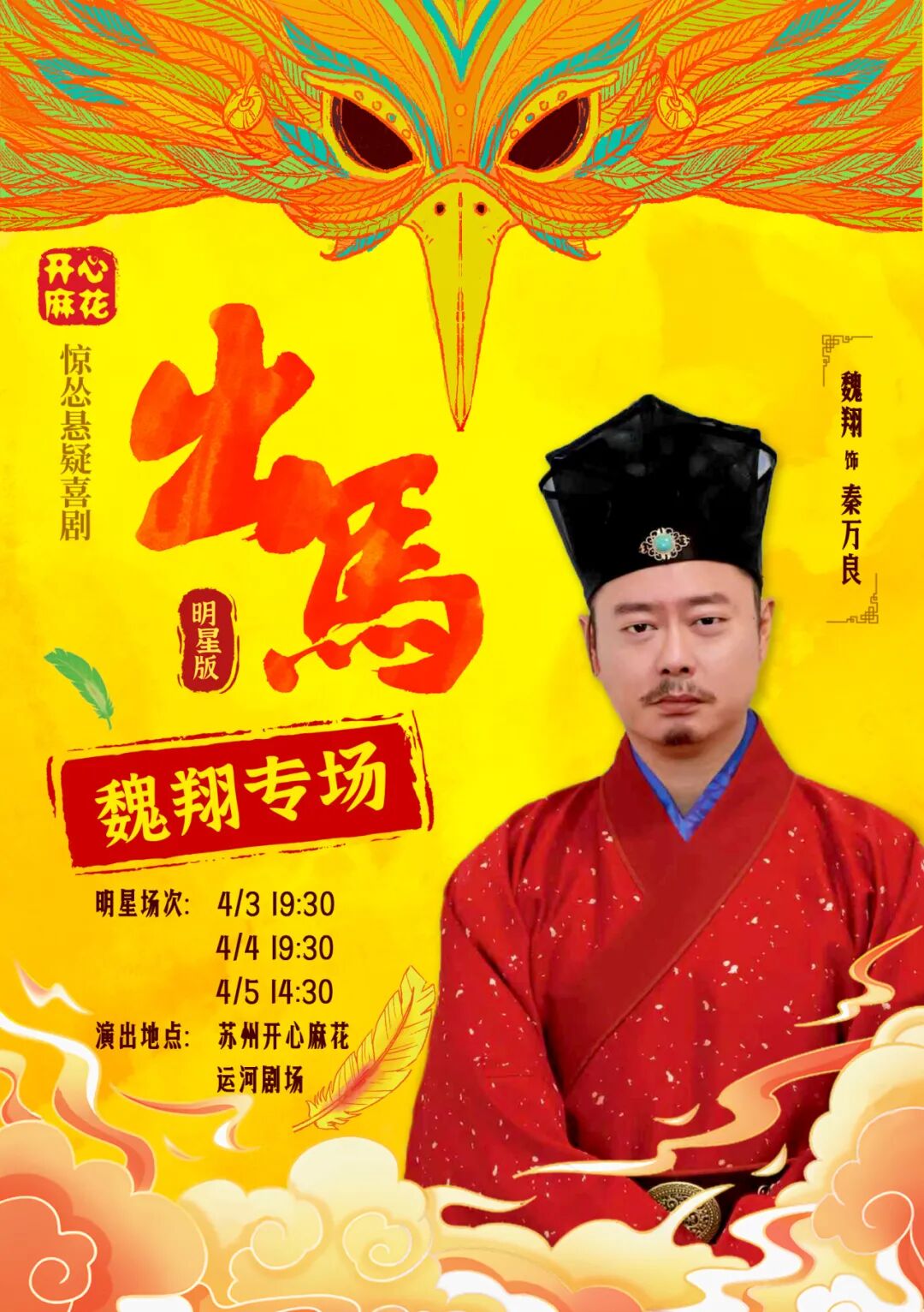 再加上魏翔领衔主演,开心麻花惊怂悬疑喜剧《出马》这次,清明假期,连演三场,千万不要错过!