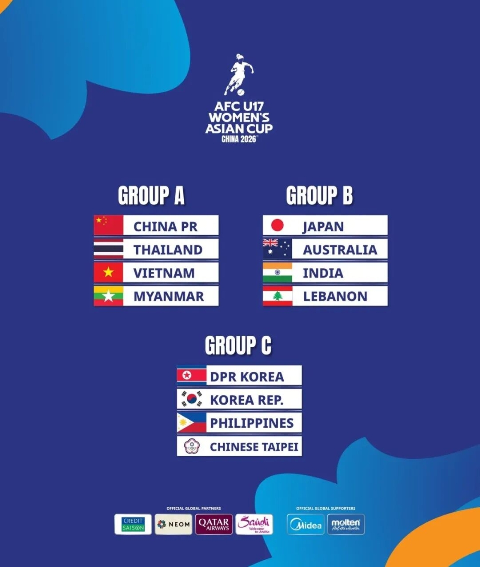 2026亚足联中国U17女足亚洲杯将于5月1日至17日在苏州举行。本次比赛共有包括中国队在内的12支球队参赛,分为3个小组,根据此前抽签结果,东道主中国U17国家女子足球队与泰国队、越南队、缅甸队同分在A组。