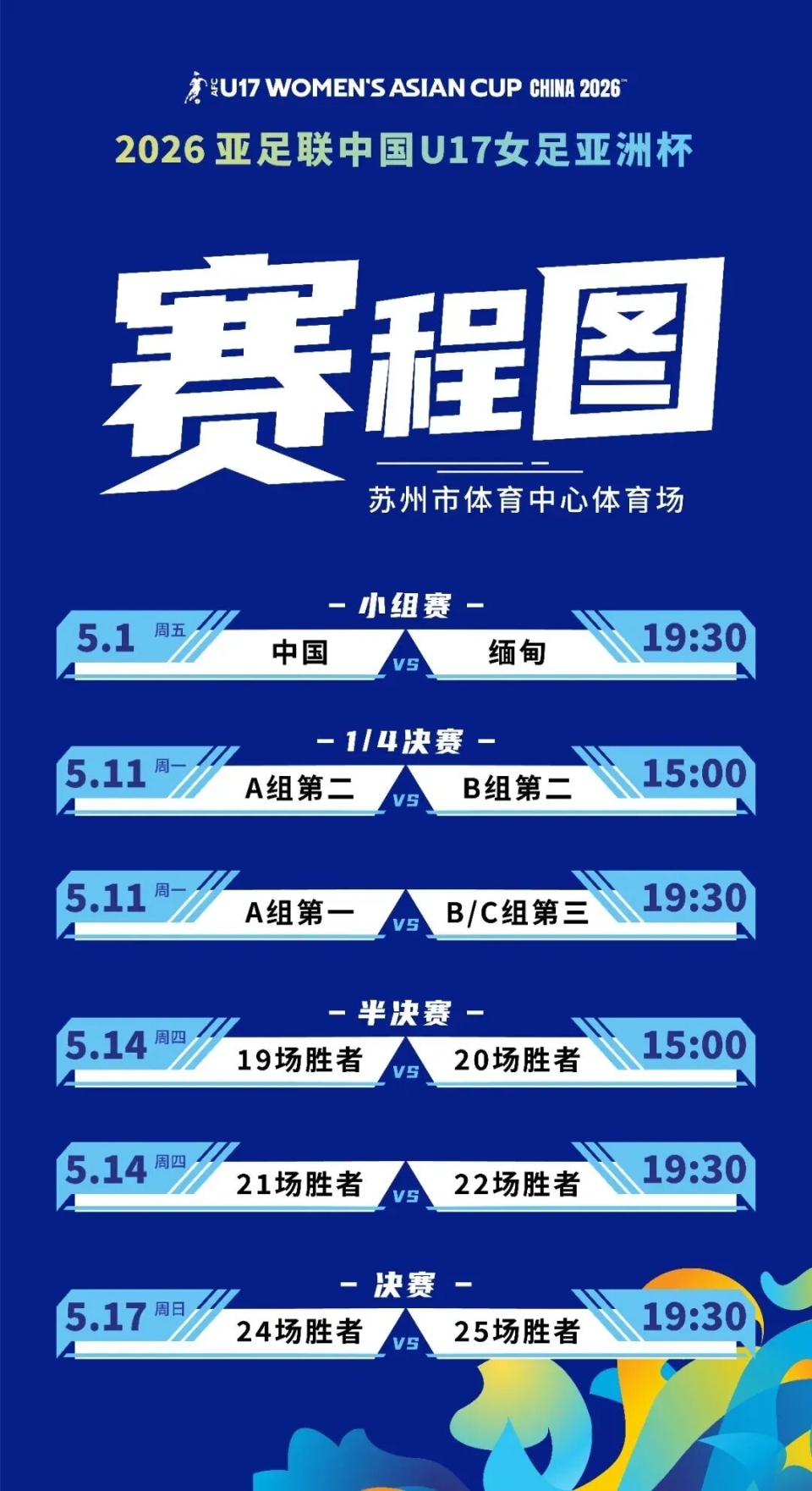 整个赛程将在苏州市体育中心和太湖足球运动中心两地赛场,进行25场比赛。其中6场在苏州市体育中心的比赛面向公众开放观赛,包括5月1日19时30分中国队与缅甸队进行的揭幕战,以及决赛阶段的5场比赛。
