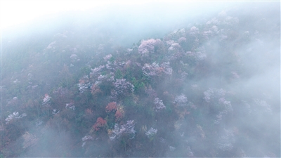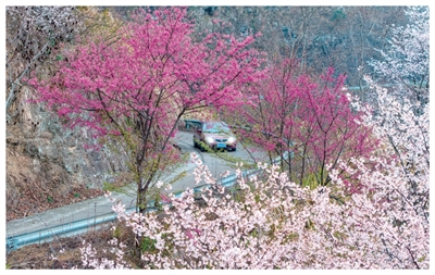 转角遇野樱天路寻樱 一个字“仙”春节后上班第一天,在上班和上进之间,我们选择了去三都上山赏野樱。这次探营,我们先直奔前源村的“浙西天路”。三都野樱花的“野”,在这条蜿蜒盘旋的山路上得到尽情诠释——这条近8公里的盘山公路,有着42个连续弯道,一路盘旋直抵云间,因其逶迤盘旋的驾驶感受和沿途一年四季的秀丽风光,一直以来都被村民和自驾游爱好者们称为“浙西天路”。从前源村山脚蜿蜒而上,两边的山林间零星几株野樱花,没有传闻中的震撼。车子拐上“浙西天路”,眼前豁然开朗:仰头看,开阔山坳毫无征兆地撞进视野——漫山遍野的野樱花,顺着起伏的山形铺展开,从山腰处一直蔓延到云雾缭绕的山顶。粉白粉白的野樱花和散落在山中的植被交织在一起,宛如被打翻的调色盘,在湿润的空气里晕染开来。这正是三都野樱花另一个“野”:只生长在海拔300-700米的群山之间,从山腰开始连片长。前源村党总支书记徐琬丽说,为了大家赏野樱更舒心,近几年“浙西天路”不断升级,在公路沿线、山坳的荒地里都抚育补种了红樱;去年还专门分两次清理山上杂树杂草,让野樱花能开得更盛;一路还设置了观景平台、休息驿站,停下来歇脚的工夫,就能把山间的樱花盛景全方位看个遍。顺着天路一路向上,山腰处的观景平台必打卡。一场春雨将山林洗涤得格外清新,山雾在林间缓缓流动,大片花林忽隐忽现,前一秒还清晰可见的花团,下一秒就藏进了白雾里,再露出来时,又多了几分仙气飘飘的韵味,活脱脱就是浙西深山里的春日仙境。“大杭州的野樱花这几年越来越多,为什么偏偏三都的最让人难忘?答案或许就藏在‘浙西天路’这一路的惊喜里。”徐琬丽说,这里的野樱花长在悬崖边,长在弯道旁,长在转过每一个山坳猝不及防的相遇里。你可以开着车在42道弯里慢慢走,车窗成为流动的画框;也可以停下车走进山林,与最原始、最野性的春日浪漫合影留念。