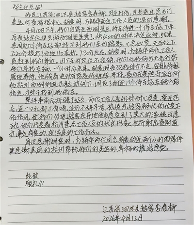 近日,外地游客李女士打进85100000热线,想表扬西湖景区两名保安毫无怨言地帮她寻找车辆,“来杭州游玩,感受到了基层工作人员的精神状态,让我这个外地游客满是幸福感。”李女士来自江苏,去年刚刚退休,几天前她自驾到杭州游玩,把车停到了西湖景区,“但景区太大了,下午准备离开时,发现找不到车了。”情急之下,李女士拨打了110报警电话,灵隐派出所民警协调街道110联动人员10分钟到达了现场。“我们分头开始找,从5点多一直找到8点多。”李女士反思道,也怪自己太大意了,停车的时候也没有记录下周边的标志信息,“到后面实在走不动了,两名保安和我说‘你站在这里别动,我骑电瓶车再去找找’。这句话让我很感动。”近晚上9点,李女士的车终于找到了。李女士说,他们只是保安,做着最基层的工作,忘记车停在哪里是我的原因,“但是他们丝毫不抱怨,基层的保安工作状态让我感受到了杭州的友好,到家后,我搜索了杭州媒体的电话,希望能传达对他们的表扬。”记者了解到,帮助李女士寻找车辆的两名工作人员名叫胡爱明和方锡华,是西湖街道指挥室110联动人员,帮助处理非警务类警情。