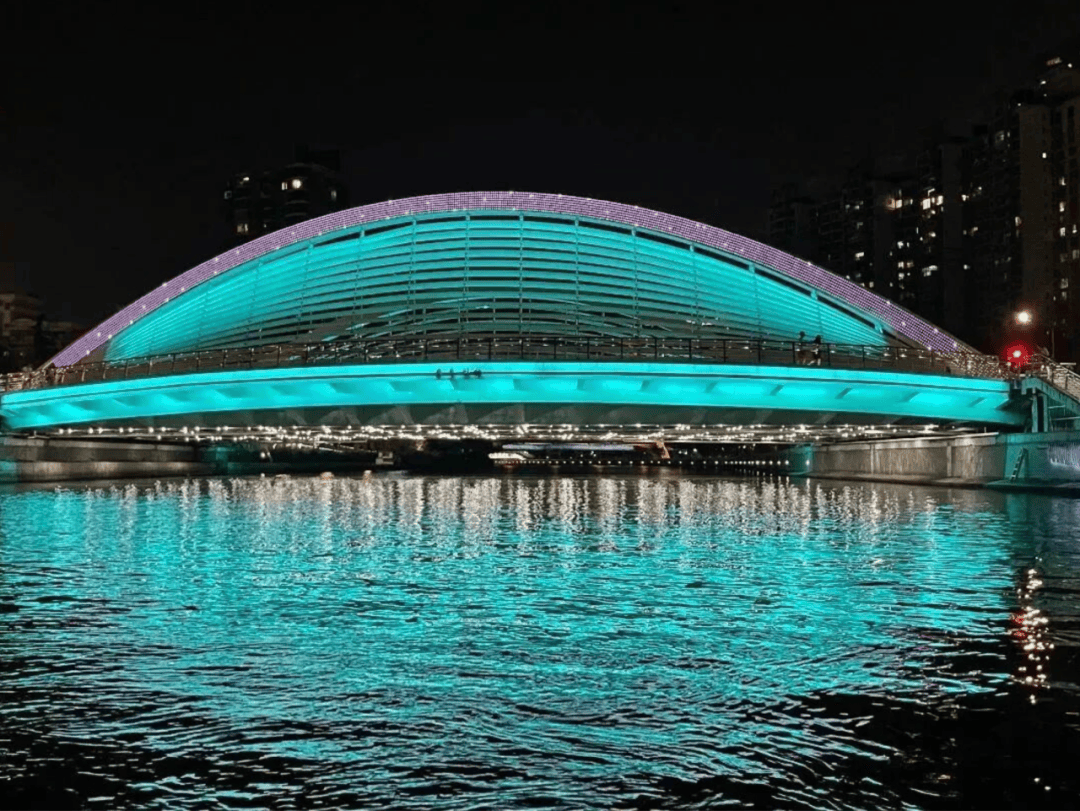再沿苏州河慢行至昌平路桥,桥身纯白,流畅弧线横跨河面。白日里,河水泛着柔光,两岸新老建筑错落有致,入夜时分,景观灯光大放异彩,恰似两只忽闪的大眼睛,被市民们亲切地称为“苏河之眼”。