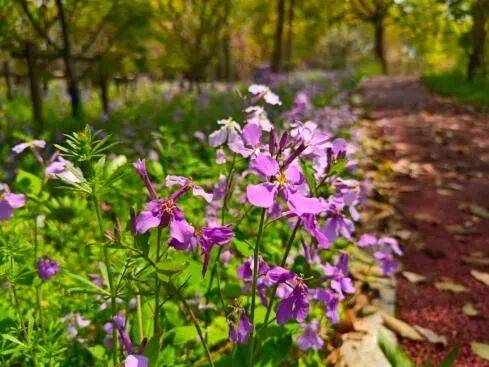 步道两侧,二月兰已铺成紫色花毯。垂丝海棠、美人梅正值盛花期,柔粉色花穗随风轻颤,与水岸倒影相融。