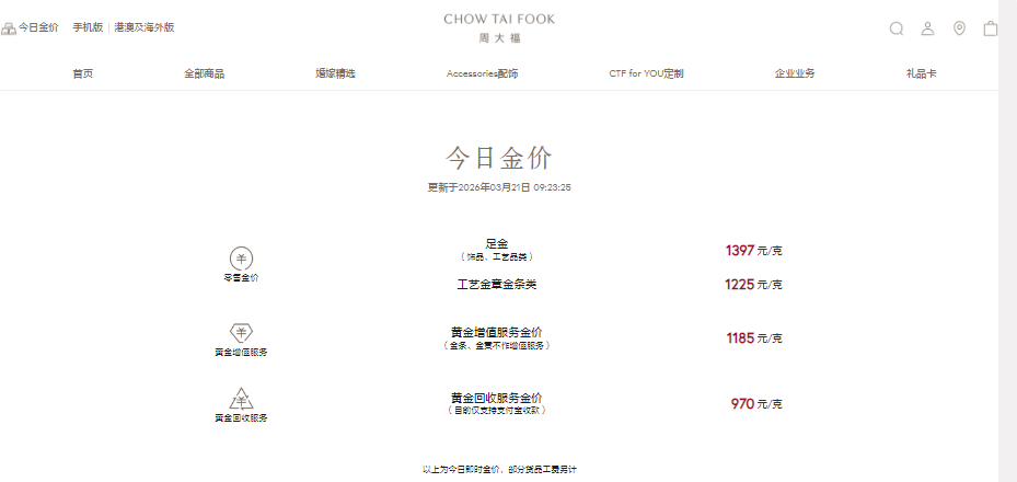 3月21日,国内品牌金饰价格较前一日继续大幅回调。周大福官网显示,其当日足金饰品价格为1397元/克,较前一日的1447元/克下跌50元/克,跌破1400元/克。周生生当日足金饰品报1389元/克,较前一日的1443元/克下跌54元/克。此外,六福珠宝、老庙黄金等知名品牌金饰价格纷纷跌下1400元/克,较前一日均有明显跌幅。与今年1月底时品牌金饰普遍突破1700元/克相比,不到两个月里,金饰价格下跌超300元/克。